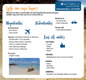 Voor buitenlandse reizen werken wij samen met WeTravel2. Zij zetten hun expertise rond heel gevarieerde